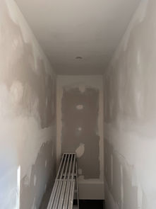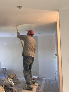 The customer requested the ceiling to be levelled to align with a modern-style layout. Joint compound was applied to smooth out the textured surface, ensuring a sleek and uniform finish that complements the contemporary design.)